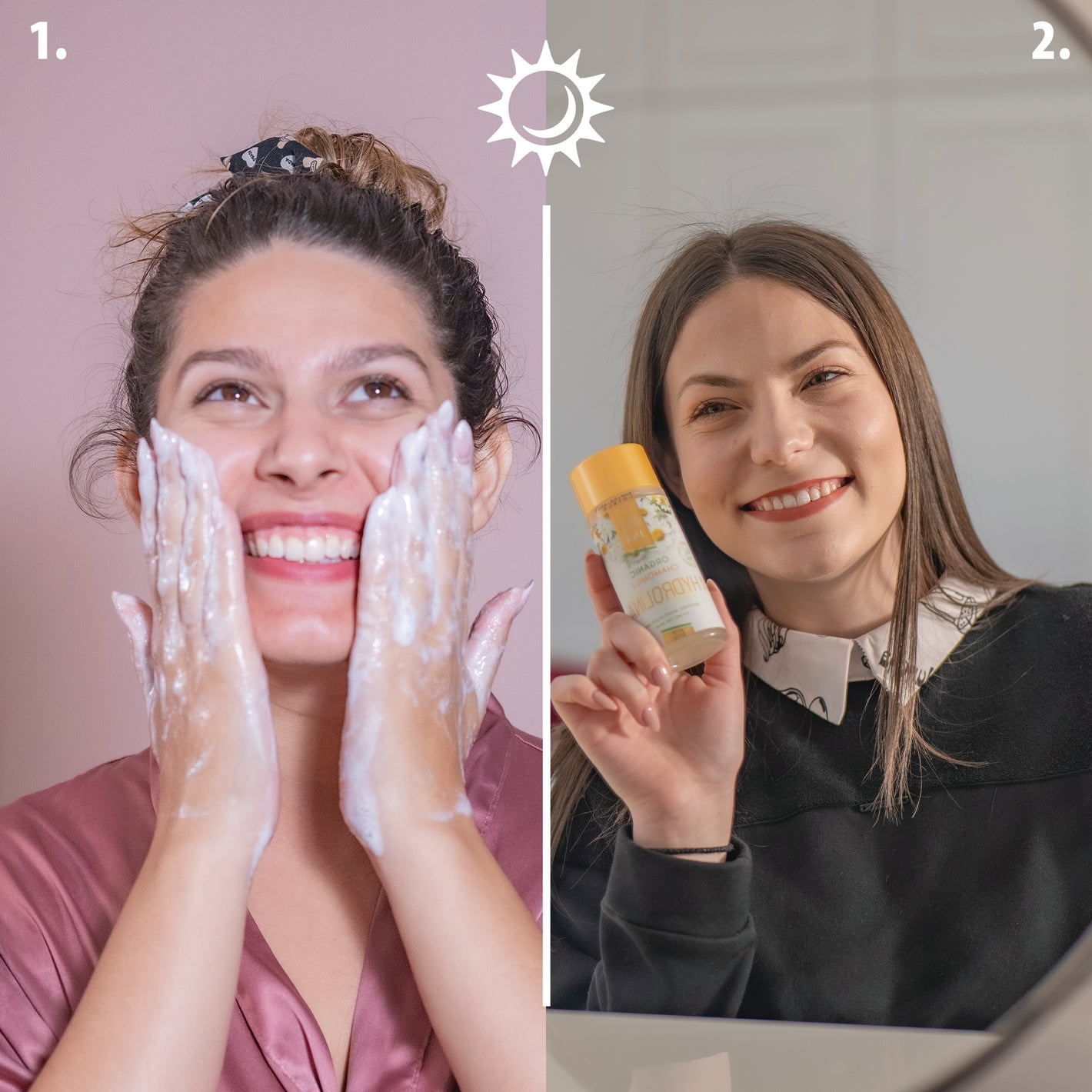 - Korak 1: Uveče, ponovite čišćenje sa našim biljnim sapunom kamilice kako biste uklonili zagađivače sa kože nakon dana.