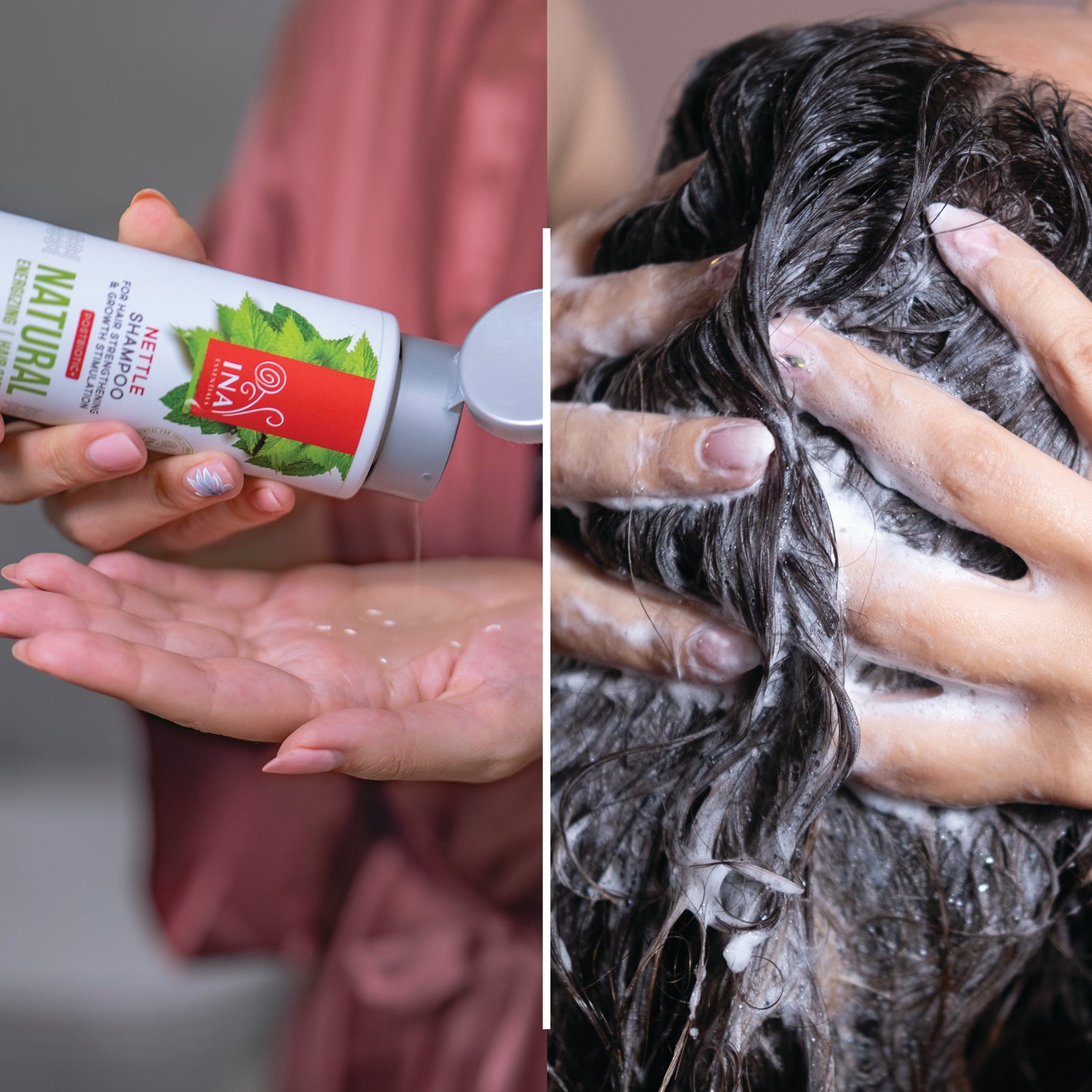 - Korak 1: Očistite kožu glave s našim novim i poboljšanim prirodnim šamponom od koprive za gubitak kose obogaćenim Hyperferment postbiotskim kompleksom - fermentiranim ekstraktima koprive, hrasta i sladića. Ovaj šampon ne samo da čisti prljavštinu,, već jača kosu, potiče rast i smanjuje gubitak kose, sve dok održava prirodnu vlažnost vaše kose.