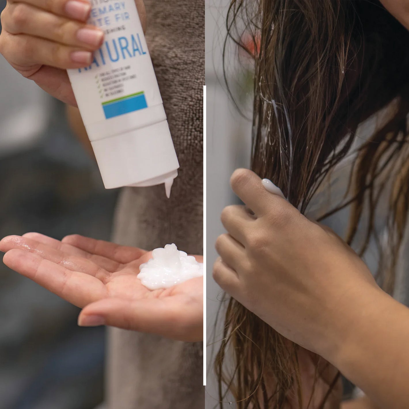 - Korak 2: Zatim, nahranite kosu našim prirodnim regeneratorom za kosu s ruzmarinom i belom jelom. On njeguje i jača kosu, smanjuje trenje, povećava sjaj i podstiče zdravi rast kose.