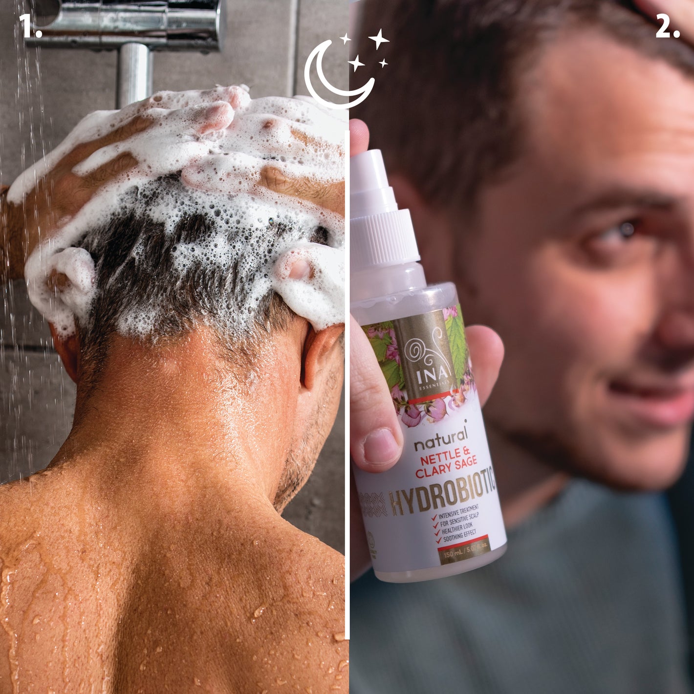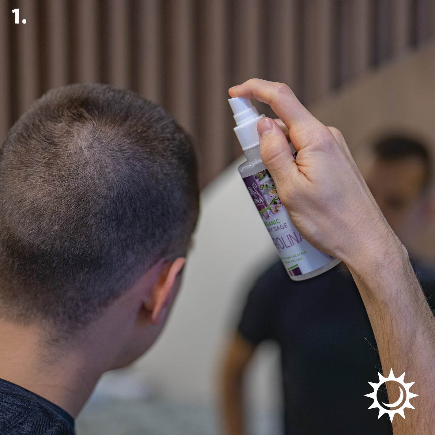 - Korak 1: Počnite svoj dan nanošenjem naše 100% organske vode od Žalfije - Hydrolina. Njene antibakterijske osobine čiste kožu glave, smanjuju perut i umiruju iritacije. Organska voda od Žalfije Hydrolina stvara zaštitni štit protiv svakodnevnih zagađivača i neguje vašu kosu, pružajući savršeno okruženje za kožu glave da diše i napreduje.